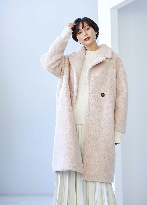 軽くてあたたかなボア素材とマイルドなピンクベージュが優しい印象のコート。