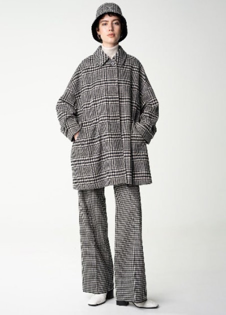 ドロップショルダーに裾へ向けて優雅に広がるシルエットが特徴。英国ブランドらしいクラシカルなグレンチェック柄も魅力。