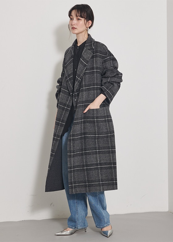 オリジナルのチェックとたっぷりとした分量感のあるシルエットが、一味違ったコートスタイリングに。