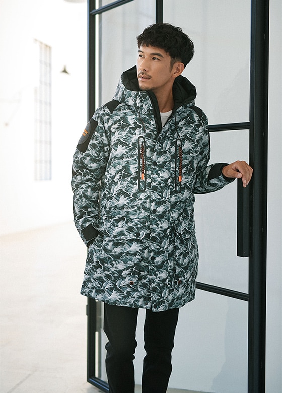 ヒートシールされたキルティングなどのテクニカルなディティールとグラフィカル柄がポイントのアウターです。