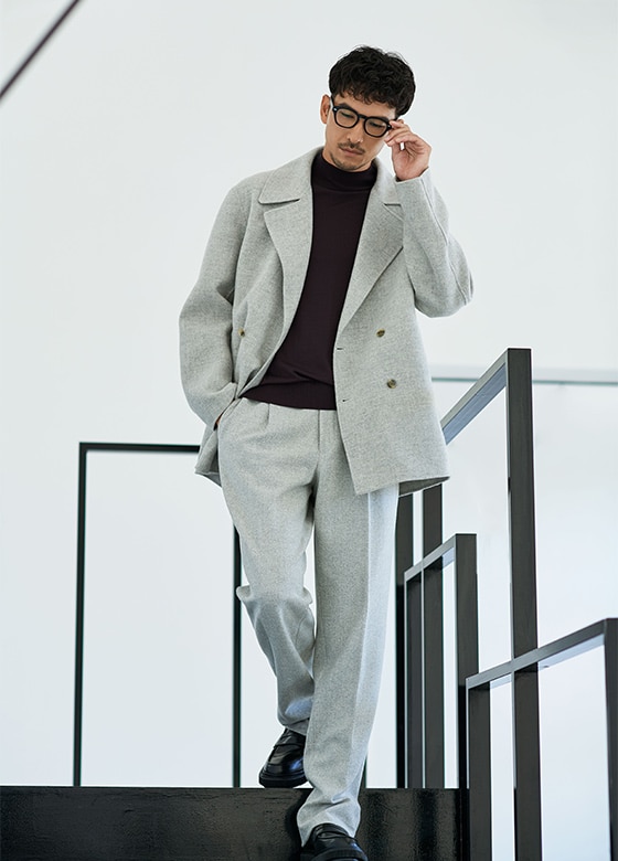 ネックラインにワイドなラペルが付いたダブルブレストコート。アルマーニを象徴するシェブロンモチーフがあしらわれた、メランジのウールファブリックで仕立てました。