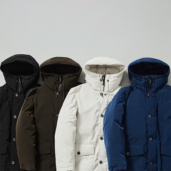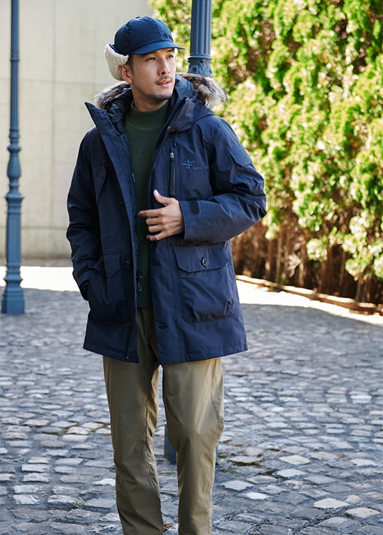 「極北の地でオーロラ鑑賞に耐えるコート」をコンセプトに開発した3WAYコート。ライナーに高品質ダウンを封入し、頭部から臀部までしっかりあたたかに。