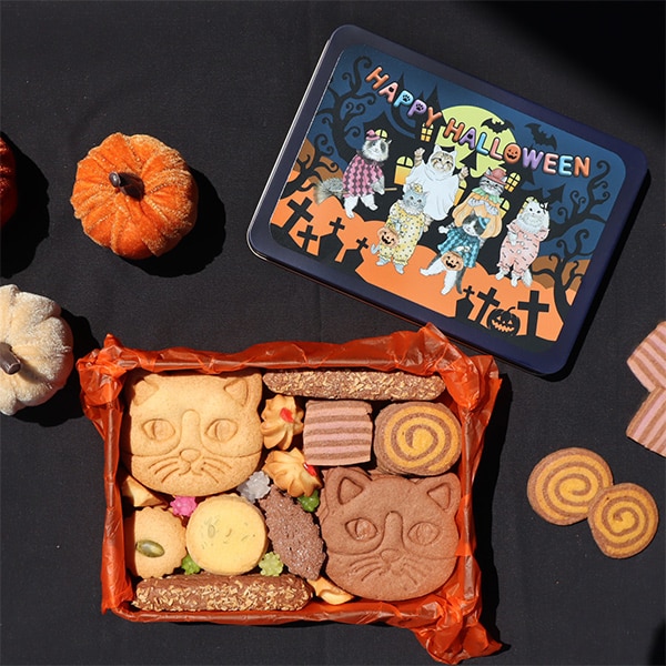 パッと目を引くプレーンとココアの2種類の大きな猫クッキーにかぼちゃの種クッキー、紫芋のラインクッキーやパンプキンクッキーなどシックで秋らしいラインアップの詰合せです。