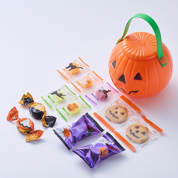 ハロウィンの季節にぴったりのジャック オ ランターン の容器に、チョコレート、クランチチョコレート、チョコレートクッキー、キャンディを詰め合わせ。