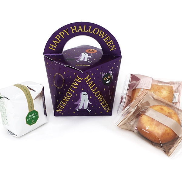 “宇治抹茶のミニトリュフケーキ”と、しっとりりんごのバターケーキやサクサクのガレットをハロウィン限定BOXに詰め込みました。