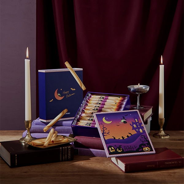 バターをふんだんに使用した生地を焼きあげ、ロール状に巻いたクッキーです。ハロウィンの夕焼けと夜の始まりが溶け合う幻想的な風景のもと、キャラクターたちがお城で開催されるハロウィンパーティーに向かう様子を描きました。