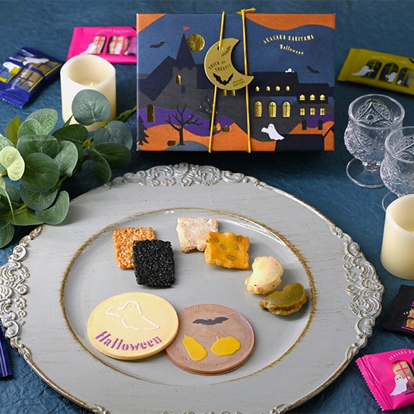 人気の玉子煎餅は、ハロウィン限定の紫芋味入り。一口おかきはかぼちゃやほうれん草、サワークリームなど、個性豊かな味でご用意しました。シックで大人可愛い化粧箱なので、季節のお手土産にもぴったりです。
