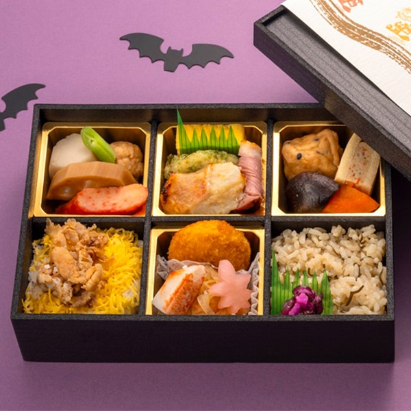 新宿高島屋のキャラクター「TTモンスター」の限定掛け紙がかわいい、二種の御飯と、南瓜バターコロッケや多彩な料理をお詰めしたお弁当です。次回ご来店時に、掛け紙ご持参で味噌汁1個プレゼントいたします。(2025年12月末日まで有効)
