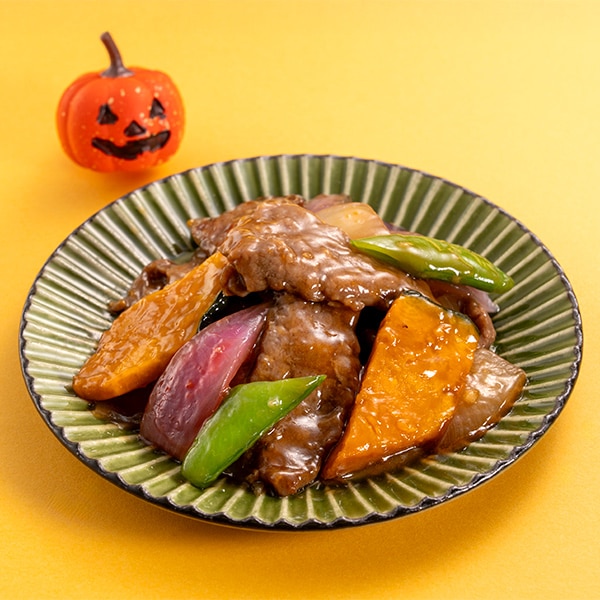 2種類の玉ねぎやかぼちゃなどの野菜を彩りに添え、牛肉をオイスターソースにて炒めました。