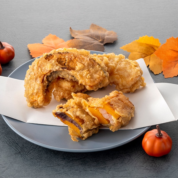 海老真丈をほくほくかぼちゃで挟み、からりと揚げた美味なる一品です。