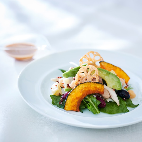 揚げたかぼちゃに、さつまいもやぶなしめじなどの秋を感じる素材や、コクのあるアボカドを組み合わせました。