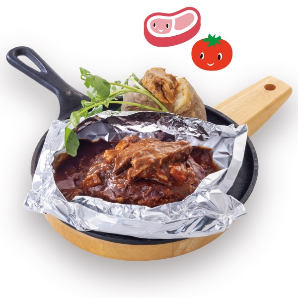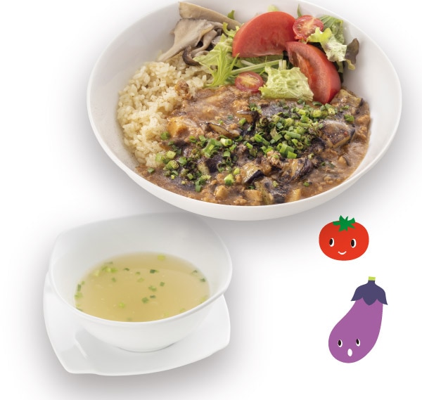 ブラックマテ茶で煮込んだ挽肉に熊本県産茄子とトマトを合わせました。グリーンマテ茶で炊いたご飯と一緒にお召し上がりください。