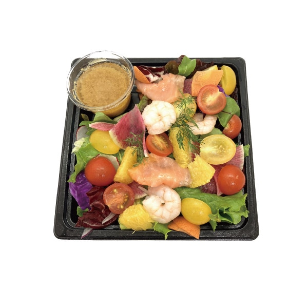 熊本県産ミニトマトをふんだんに使用しスモークサーモン、海老などもトッピングした見た目も華やかなサラダです。