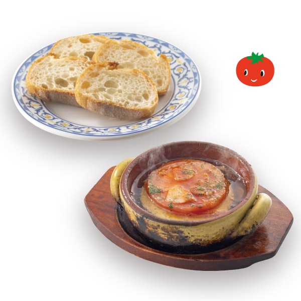 熊本県産トマトを厚く輪切りにスライスして、丸ごと1個のカマンベールチーズをアヒージョにしました。トマトの甘味と酸味にカマンベールの濃厚さが加わったアツアツのアヒージョをお召し上がりください。 (バゲットは別売り 4枚380円)