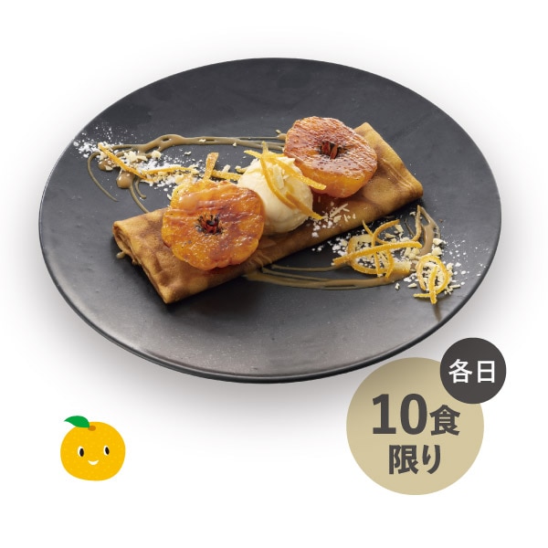 熊本県産みかんをキャラメリゼ。ホワイトチョコレートのアイスにクリームキャラメルソース、みずみずしいみかんにクリーミーな甘さのアイス、キャラメルソースがベストマッチなデザートに仕上げました。