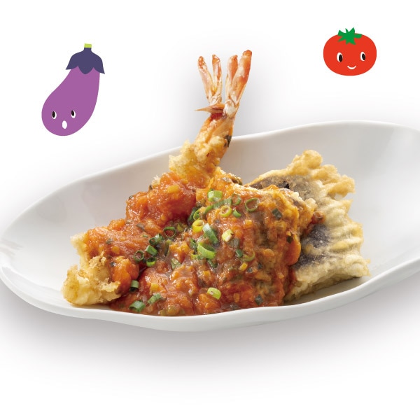 熊本県産トマトを使ったフレッシュなチリソースを大海老と熊本県産なすの天ぷらにかけた、新しいスタイルの天ぷらです。
