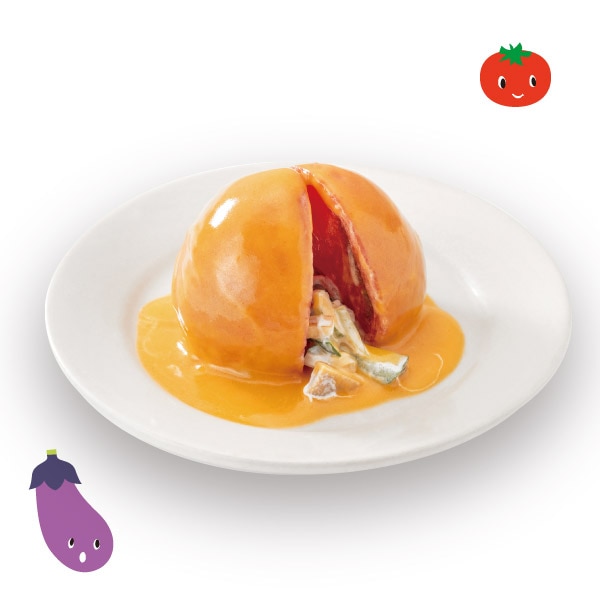 熊本県産トマトの中にチキンとオニオンのサラダを詰め、特製ドレッシングをたっぷりとかけました。