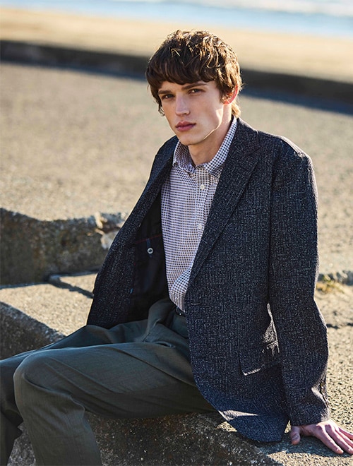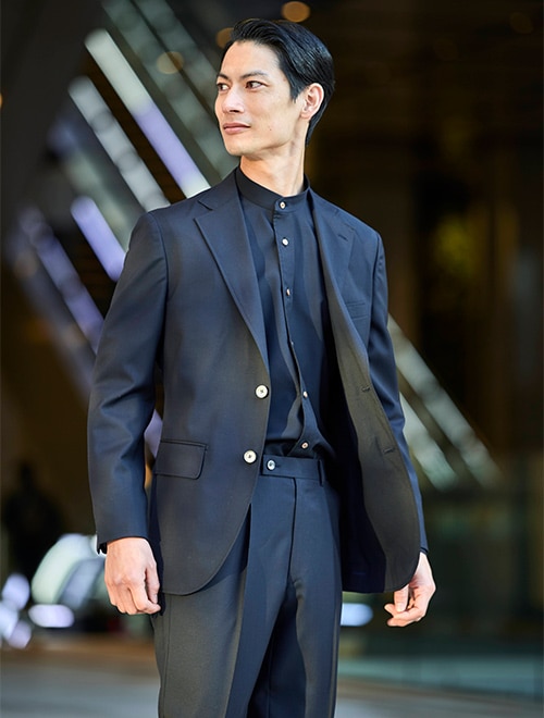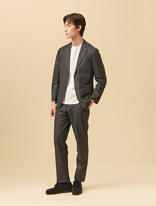 「御幸毛織」と共同開発した素材でスーパー130'sウールを高番手に紡ぎ、軽やかな平織りで仕上げた、上質な肌触りと心地よさが特徴。ウォッシャブル加工の対応も可能。共生地のシャツもオーダー可能。