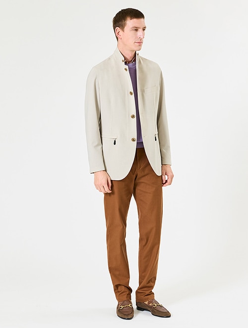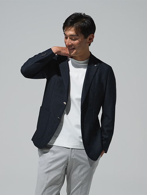 適度なハリ感と布帛のような見え方が特徴の丸編みニット生地使用したトラベルジャケット。トリアセの清涼感やウールのタッチがうまくミックスされた素材はキレイ目にもカジュアルにもあわせられる万能素材。