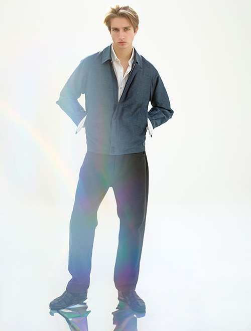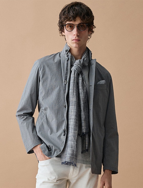 シャンブレーの見た目の涼しさとシャリ感が夏に最適なイージーケアジャケット。麻のような見た目とシャリ感ですがポリエステル100でシワになりにくく、ラフに扱えます。