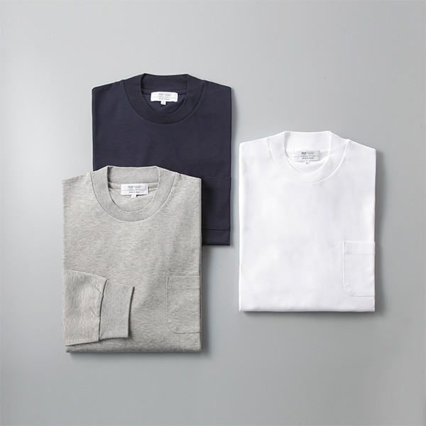 1枚でもサマになり、インナーとしても 着まわしやすい長袖カットソー。後ろ衿をやや高めに設計しジャケット やシャツの衿元汚れ防止にも配慮、オンオフ問わず着用OKです。