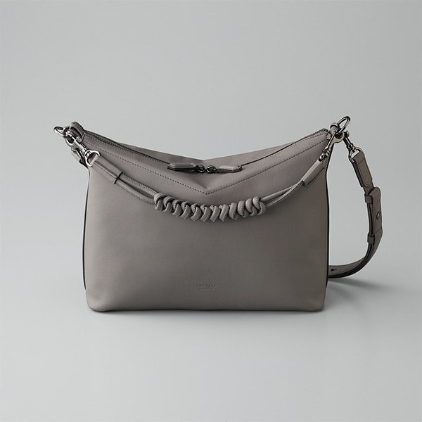 イタリア・トスカーナを拠点とし、サステナビリティに取り組むタンナーで鞣した高品質なレザーを採用。本体や引手、ショルダーベルトには矢羽根をイメージしたカッティングが施され、スネークノットで編まれた着脱可能なハンドルが、アイテムに唯一無二の個性を加味しています。