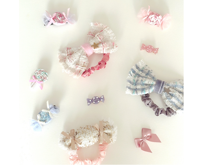 定番のグログランやベロアのヘアアクセサリーに加え、今回のポップアップでは、秋のお出かけや、パーティーにお供したくなるようなポシェットや、ツイードのヘアアクセサリーを揃えました。