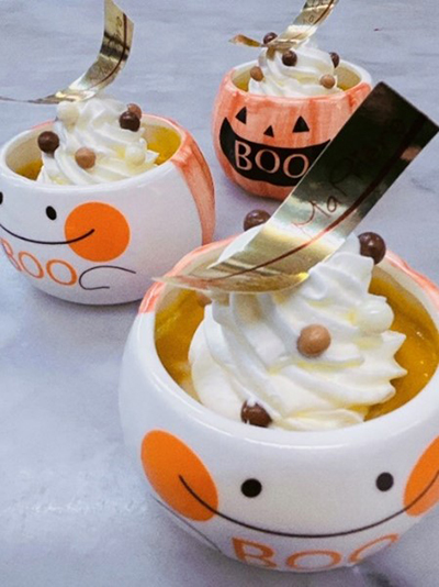 ハロウィンカップに生クリームパールクラッカンで仕上げたパンプキンプリンです。