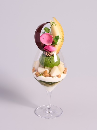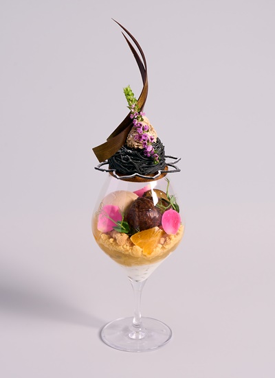 和栗の甘露煮やアイスクリームを主軸に、芳ばしい金胡麻のアイスや爽やかな柚子、柑橘や山椒を使用して香り華やかにまとめたパフェ。