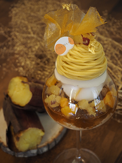 濃厚な安納芋と甘酸っぱい杏(あんず)の組み合わせ。 安納芋のクリームや甘露煮の甘さに杏のソースやコンポートの酸味、そこに焙じ茶の香ばしさが加わりほっこりとした冬の装いのパフェに仕上げました。
