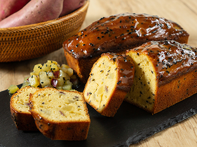さつまいもをそのまま練りこんだしっとり生地に、黒ごまとさつまいものダイスを混ぜ込み、おいもの甘さを存分に引き出したパウンドケーキです。