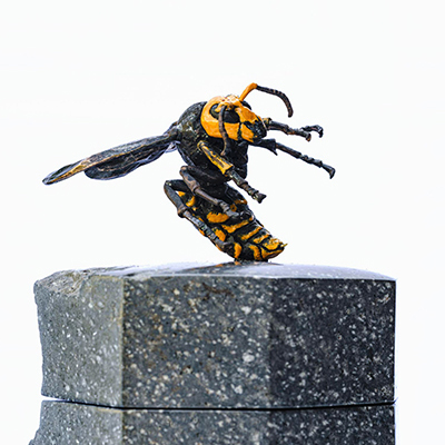 「オオスズメバチの石製柱状茶入」 w8.3×d7.2×h14cm ブロンズに色漆、真鍮、本小松石(真鶴産)