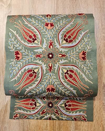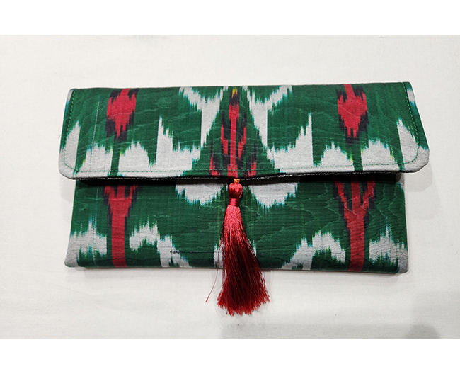 シルクロードの中継地ウズベキスタンで生産される、日本の絣と同じような技法で織られた布で 帯やストールを展開。