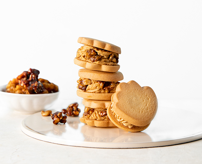 キャラメリゼしたくるみのカリカリとした食感と、2層のキャラメルクリームを、厳選したバターを贅沢に使ったかわいい手形のクッキーでサンドしました。キャラメルは、焦げすぎないよう職人が丁寧に火加減を調整しておつくりしています。キャラメル本来の甘さとほろ苦さを感じることでき、濃厚な味わいながら後味のよい甘さに仕上がりました。