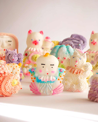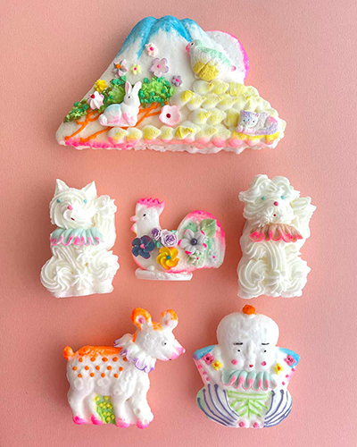 絵画のほかにも、金花糖をはじめ、砂糖を使用した色とりどりの立体作品やアートトースト、樹脂時計など、遊び心あふれる新作が登場。