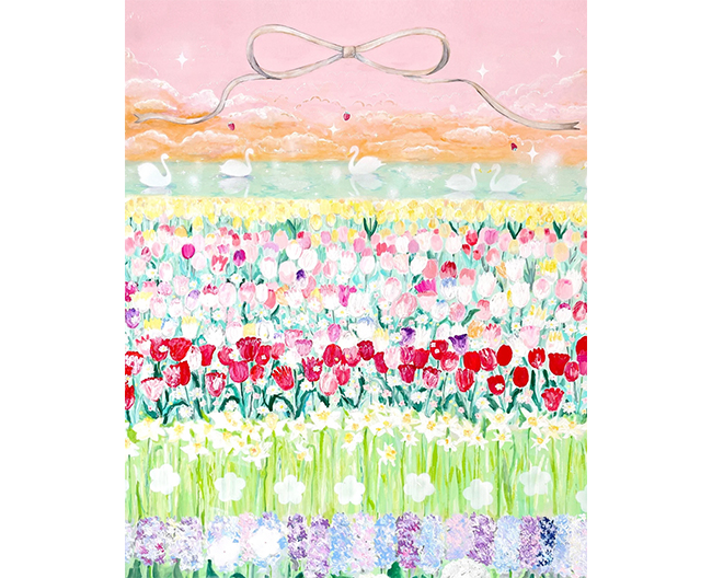 本展ではリボンや花、光や感情のゆらぎといったモチーフを通して、大人の女性の少女性を肯定し、祝福する世界を鮮やかに表現。サブタイトルの「FLOWING(=「流れる」「没入」)」に示されるように、何かに夢中になることで生まれる浮遊感・解放感・自由さを観るものに感じさせます。