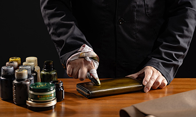会期中は、店頭受付限定の「カスタムオーダーイベント」も開催。革素材の中でも人気が高い「ピットヌメ革 手染め」は、職人が1点1点、手作業で色を重ねて仕上げていきます。全9色の中から、お好きな1色をお選びいただけます。