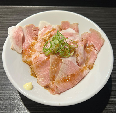 今回のカフェむにぺこ限定メニューの肉丼は、スライスした柔らかなチャーシューの上に甘辛なたれを添えた一品。