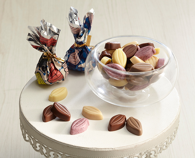 小さなカカオ豆型のチョコレートを、アフリカの伝統的な1枚布・パーニュをイメージしたカラフルなフィルムで包みました。カカオのうまみをぎゅっと詰め込んだカモメの自信作です。