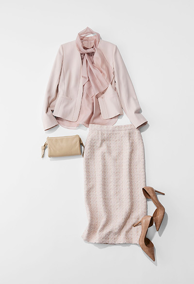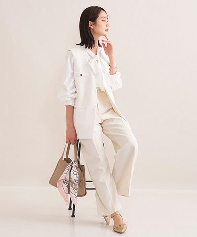 なめらかでパウダリーな素材を使用した上品なボウタイのブラウスを合わせてハレの日、通勤、普段使いまで幅広くお使いいただけるコーディネートです。