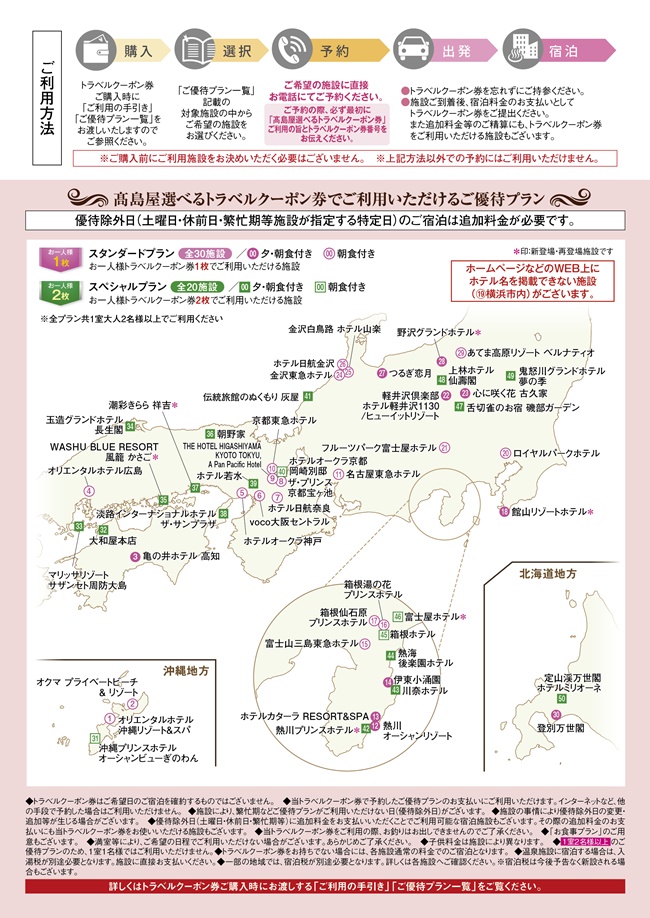 ・宿泊施設は1泊1名様クーポン券1枚の基本プランと2枚のスペシャルプランがございます。