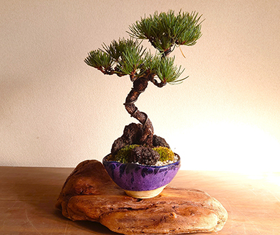 小さな作品ですが、植物とその植え付け方、景石(阿蘇の溶岩石)の配置、苔は陸地で化粧砂は水辺や道とそれぞれに役割や個性があります。