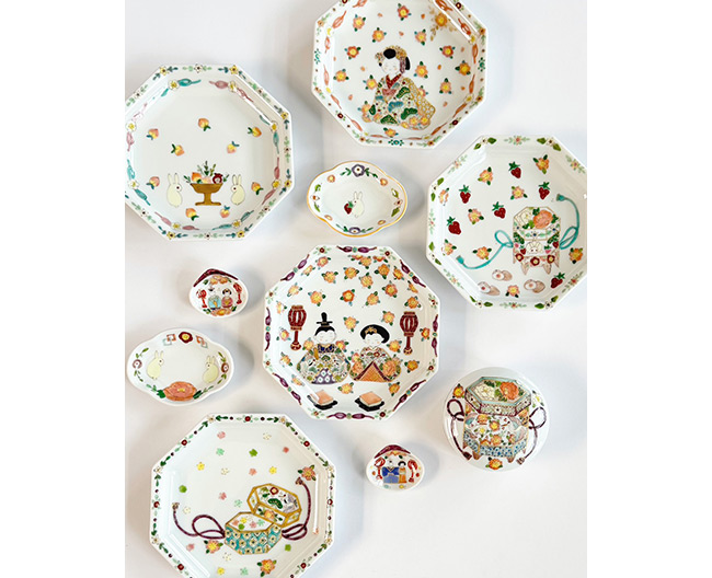 白磁の生地に有田絵付けにて全て手描きで描かれた曽我部治子さんの器は柔らかな色使いと、独自のデザインが特徴です。前年に引き続き、今回も曽我部さんらしい「かわいい」がいっぱい詰まった器をご用意し、お雛様の新柄も取り揃えました。