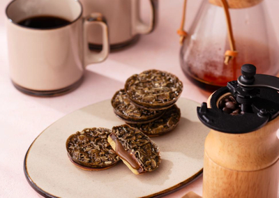 深煎りコーヒーを合わせて焼き上げたアーモンドフロランタンとバターサブレで、とろける食感のヘーゼルナッツキャラメルとミルクチョコレートをサンドしました。
