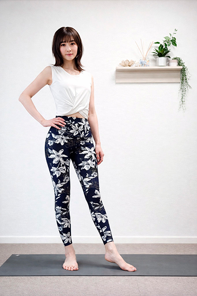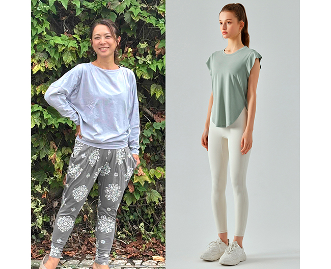 身体の動きに寄り添う機能性と、さりげない体型カバー、洗練されたデザインが共存し、スタジオでも日常でも違和感なく溶け込む。