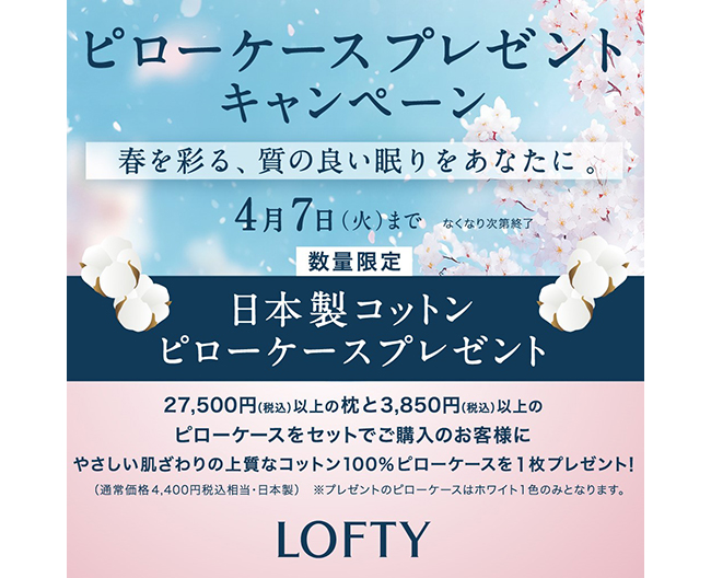 期間中、税込27,500円以上のロフテーピローと税込3,850円以上のロフテーピローケースをご購入のお客様にオリジナルピローケース(日本製、綿100%、ホワイト)をプレゼント!
