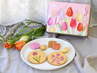 色とりどりに咲くチューリップをあしらったデザイン缶に、お花や葉っぱの形の可愛いおかきを詰合せました。お祝いやお世話になった方への贈り物にもおすすめです。