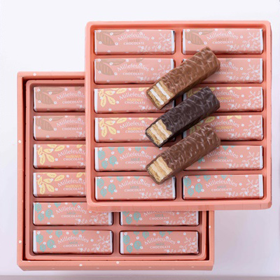 香ばしく焼いた3層のパイの間にリッチな味わいのクリームをサンドして、チョコレートで優しく包みました。