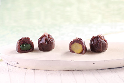 一粒栗を丹波大納言小豆で包んだ一壷天、蓬の羽二重餅を大納言小豆の餡で包んだ野づつみの詰合せです。