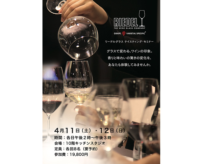 毎回ご好評いただいているリーデルのワイングラスセミナー。ソーヴィニヨン・ブラン、シャルドネ、ピノ・ノワール、カベルネ/メルロ、4種類のグラスを用い、ワインとグラスのベストマッチが導き出す驚きと感動の体験お楽しみください。